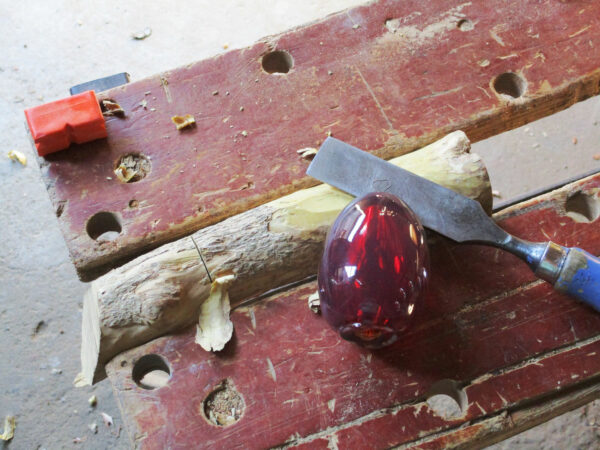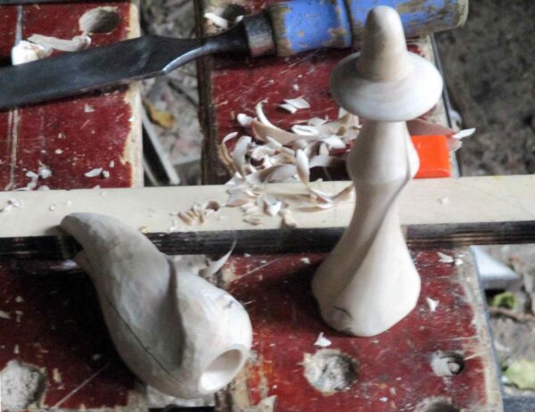 Un tronc de houx…Quille et boule dans le même morceau.Dégrossissons.Nous ne sommes pas loin du final.La quille réalisée, passons à la boule !La forme générale est là…Ponçage et reliage…Le grain fin du bois souligne l’élégance de l’objet.
