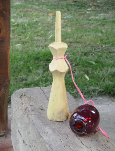 La quille sera en prunierTeinte claire et grain fin apparaissentLa silhouette se préciseDu buis pour la boule Certains nœuds conservés complètent les formes organiquesLes deux éléments sont reliés par un cordon noirEt voici le bilboquet de Gérard…