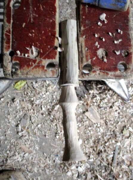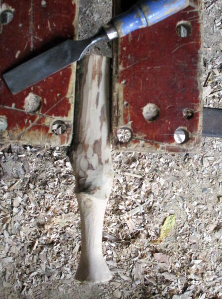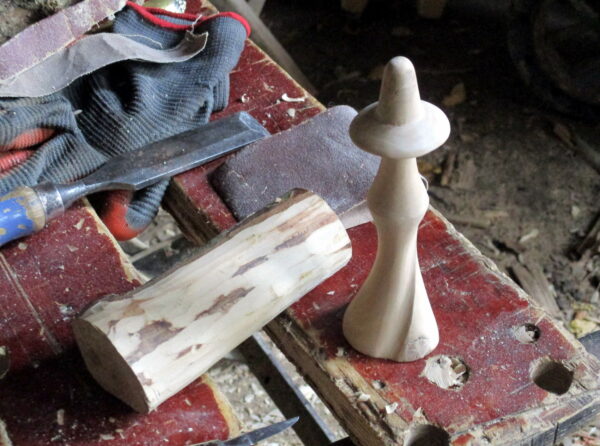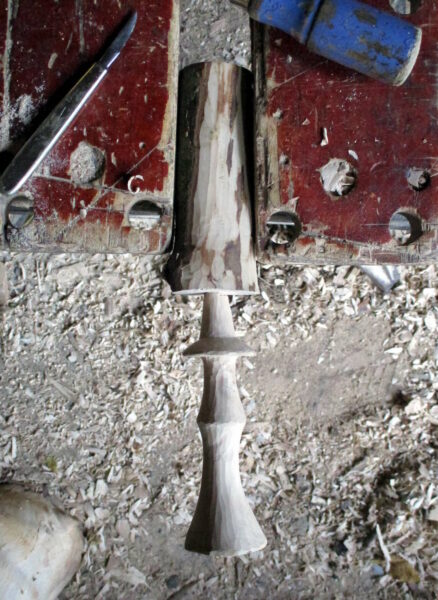 Élagage d’un bosquet de chêne vert…La boule conserve en partie le relief du bois.Attaquons-nous à la quille !Ce bois est assez facile à façonner…Les deux pièces quasi prêtes…La veine du chêne se voit bien.