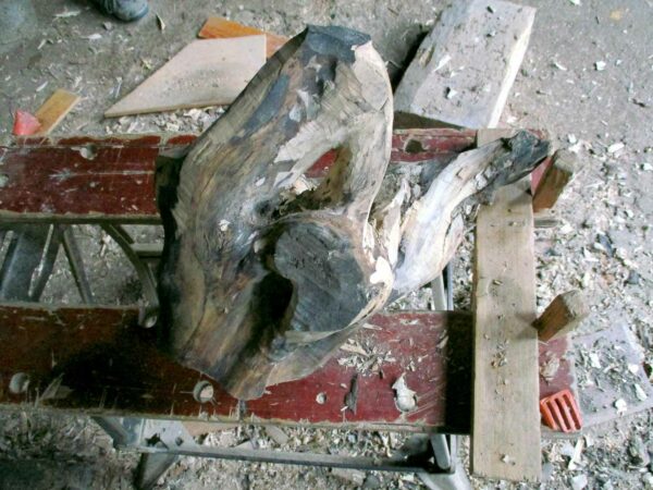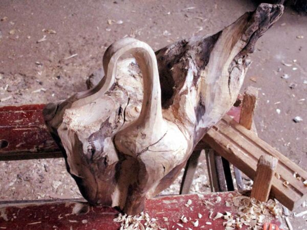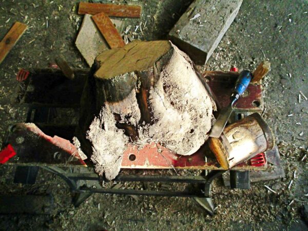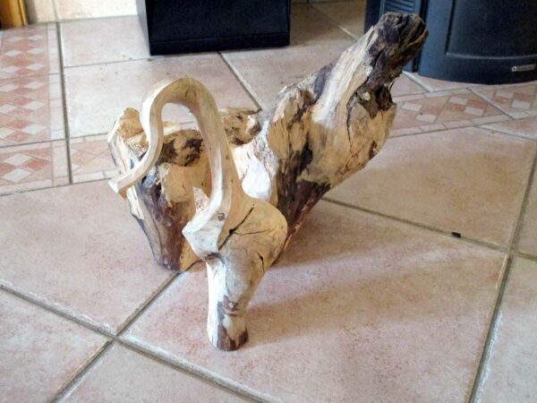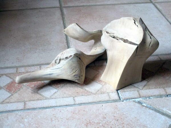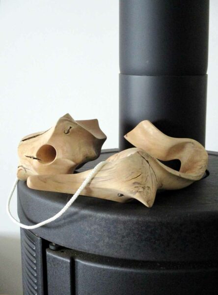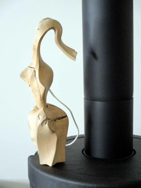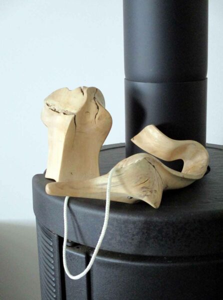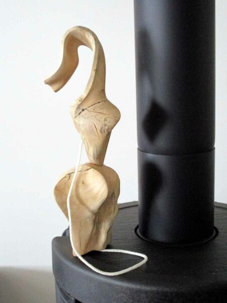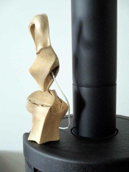 Une souche promise au feu me fait du charme…Sous son emprise, je la déshabilleSes rondeurs m’éclairent alorsGouges et ciseau rithment notre danse…La quille s’affranchit enfin de la soucheUne autre pièce rejoint la quilleIl faut équilibrer cet objetUn cordon immaculé unit quille et « boule » Ironique, Philboquet pose sur le poële…Redressons-nous un peu…Et là, apprécions la grâce du bébéL’objet tourne et vire, tout content……De nous montrer toutes ses facettes !